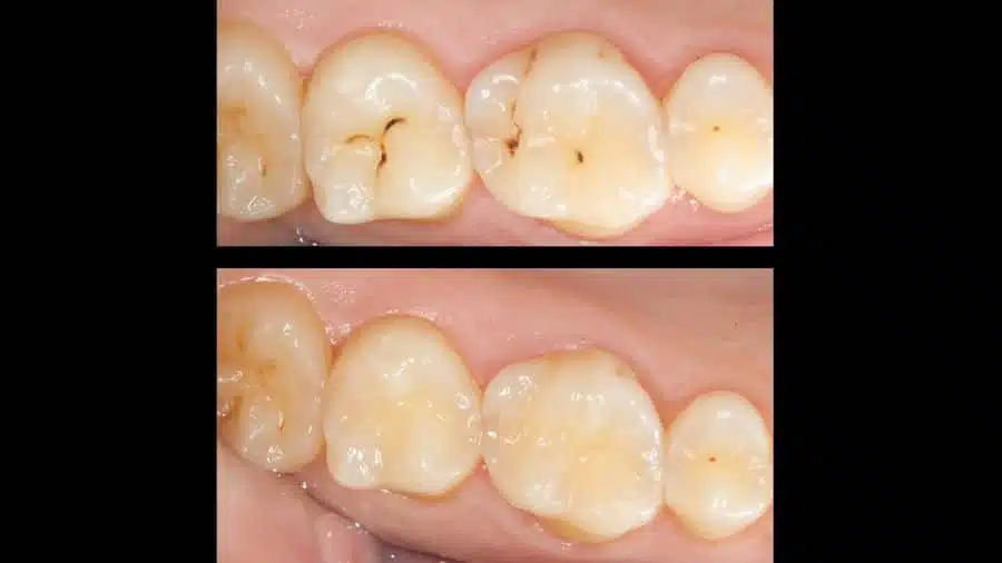 Furthermore, the use of air abrasion means we can cure even extremely small caries. It is a minimally invasive method for treating caries. The combination of early detection (DIAGNOdent, radiovisiography, endoscopy, etc.) with minimally invasive caries treatment improves and simplifies the maintenance of dental health. In this manner we can cure caries with minimal repair work, maintaining the maximum amount of healthy tooth as possible, with no need for anaesthesia, with no discomfort, in a short time, inexpensively and with a better long-term outcome.
